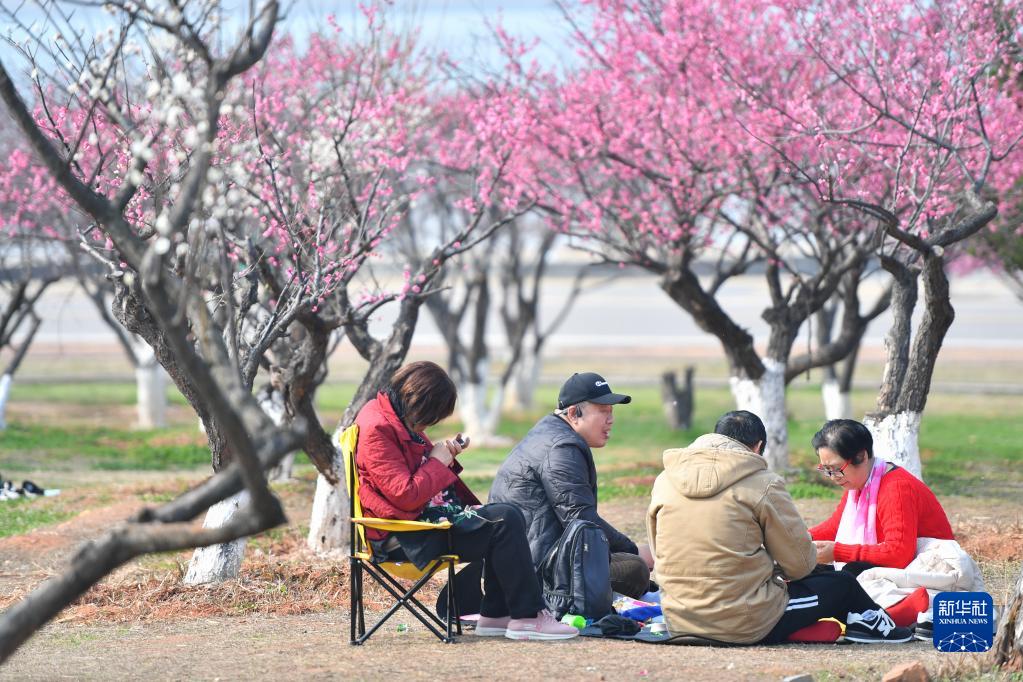 2月20日,游客在位于湖南省長沙市長沙縣的湖南松雅湖國家濕地公園的梅花林旁休息。