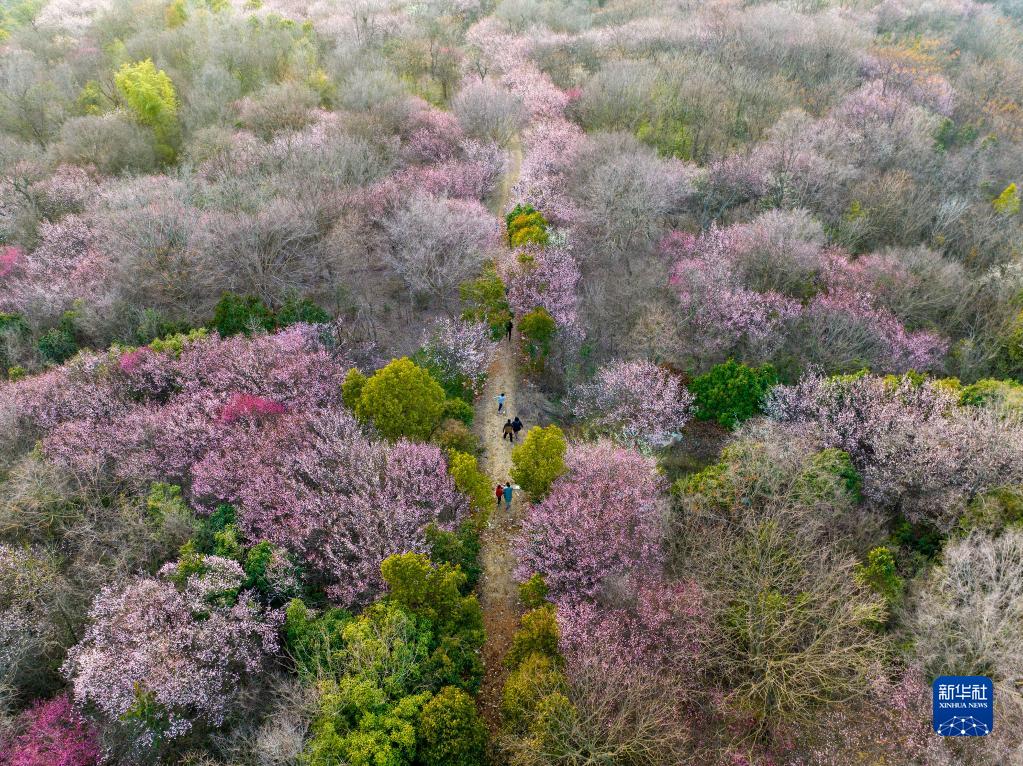 2月19日,人們在安徽合肥市肥東縣長臨河鎮巢香梅園內欣賞盛開的梅花(無人機照片)。