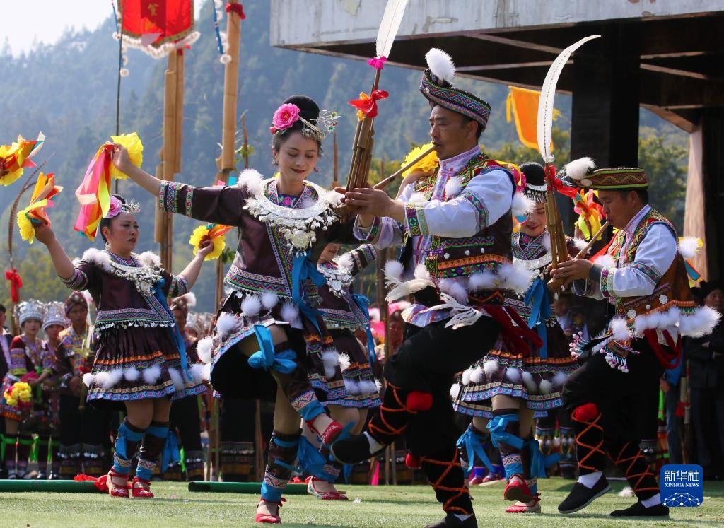 2月20日,在廣西融水苗族自治縣洞頭鎮洞頭村,苗族群眾在跳蘆笙舞。