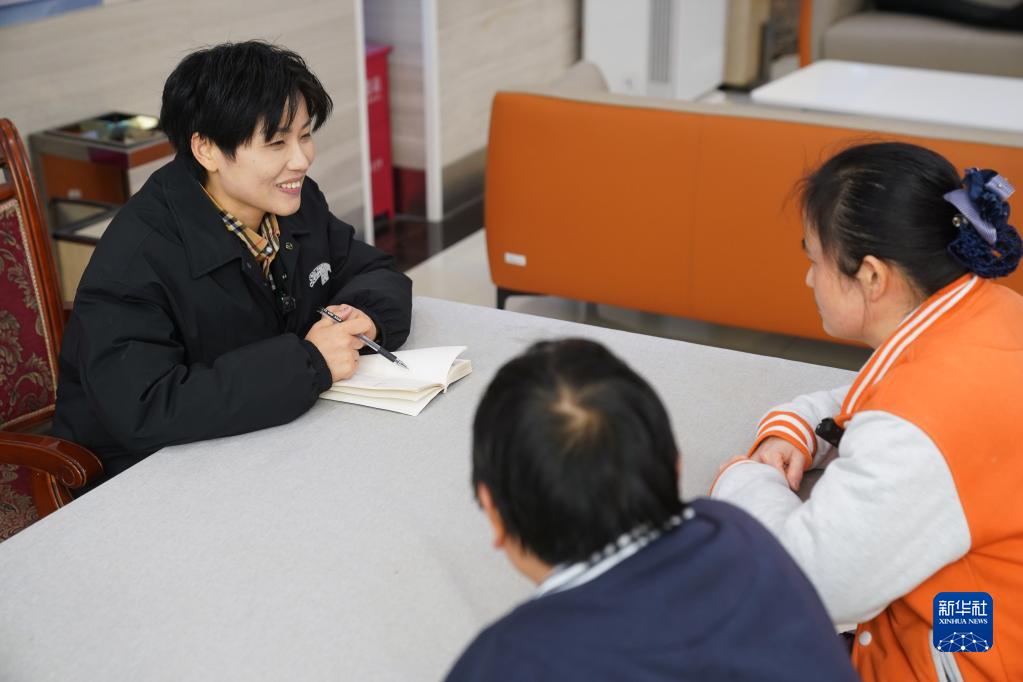 2月14日,李楠楠(左)下班后走訪南通市陽光老年公寓,和護理員交流。