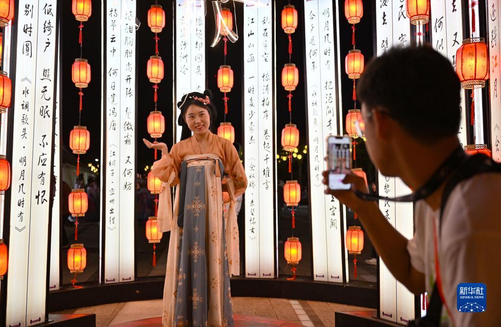 游客在海口日月廣場的古風市集拍照留念(2月19日攝)。