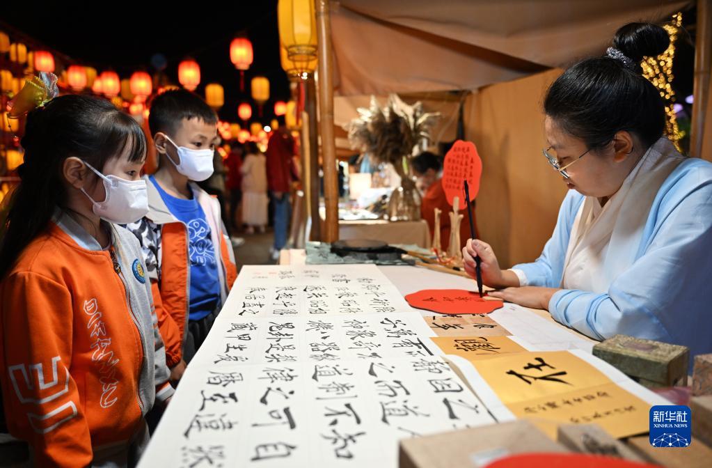 小朋友在海口日月廣場的古風市集觀看攤主展示書法技藝(2月19日攝)。