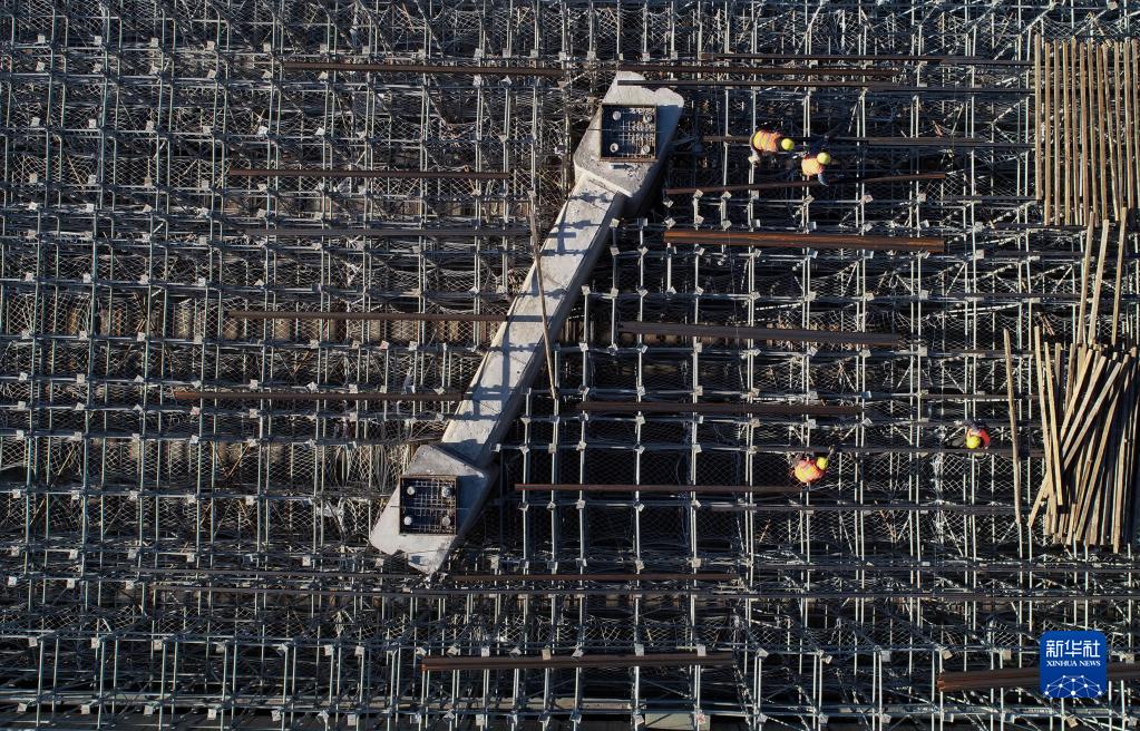 2月20日,中交路橋建設有限公司的工人在石家莊市新華區境內的北三環市政化改造項目建設工地施工(無人機照片)。