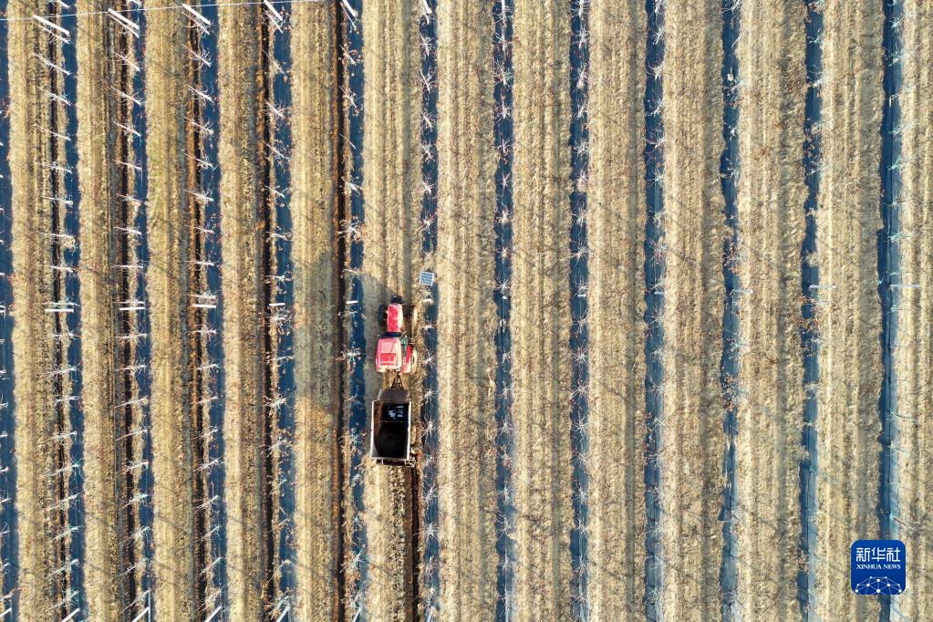 2月19日,在夏莊鎮甲夼區域鄉村振興共富黨建聯盟一處現代化蘋果產業基地內,村民在進行果樹修枝、施肥作業(無人機照片)。