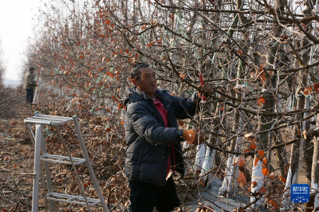 2月19日,在夏莊鎮(zhèn)甲夼區(qū)域鄉(xiāng)村振興共富黨建聯(lián)盟一處現(xiàn)代化蘋果產(chǎn)業(yè)基地內(nèi),村民在進(jìn)行果樹修枝作業(yè)。