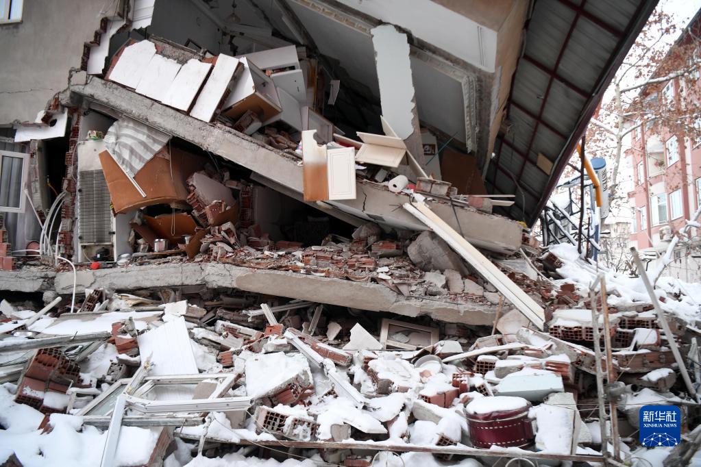 這是2月7日在土耳其卡赫拉曼馬拉什省南部的埃爾比斯坦地區拍攝的地震中受損的建筑物。