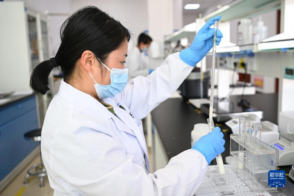 在武威市涼州區一家企業牧場,工作人員檢測鮮奶品質(2月18日攝)。