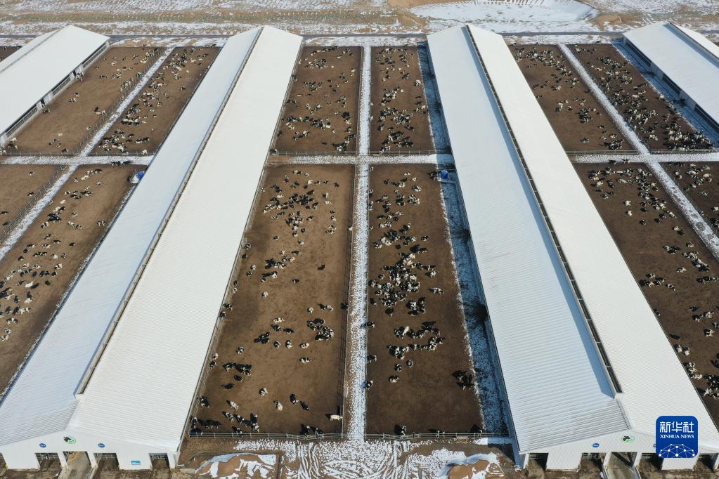 這是2月18日在武威市涼州區一家企業牧場拍攝的奶牛棚圈(無人機照片)。
