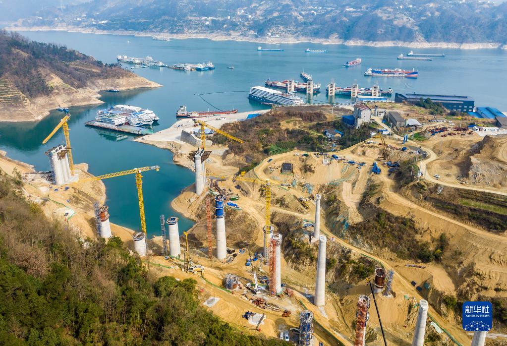 2月20日,工人在三峽庫區湖北省宜昌市秭歸縣三峽樞紐茅坪港疏港鐵路建設工地施工(無人機照片)。