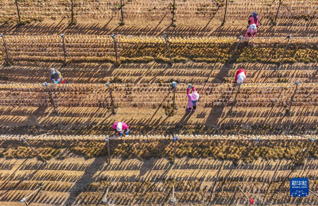 2月20日,在榮成市靖海灣畔一處晾曬場,漁民在晾曬魷魚(無人機照片)。