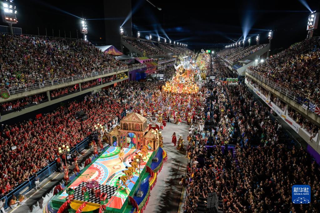 2月19日晚,在巴西里約熱內盧的桑巴大道,一輛桑巴舞校花車參加狂歡節游行。