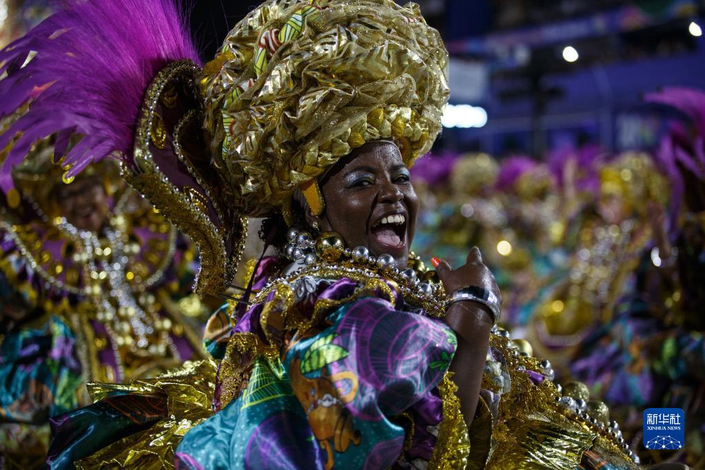 2月20日凌晨,在巴西里約熱內盧的桑巴大道,桑巴舞校演員參加狂歡節游行。