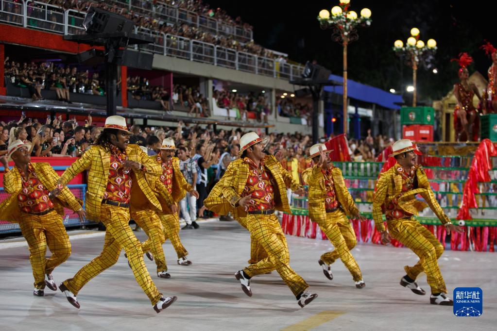 2月19日晚,在巴西里約熱內盧的桑巴大道,桑巴舞校演員參加狂歡節游行。