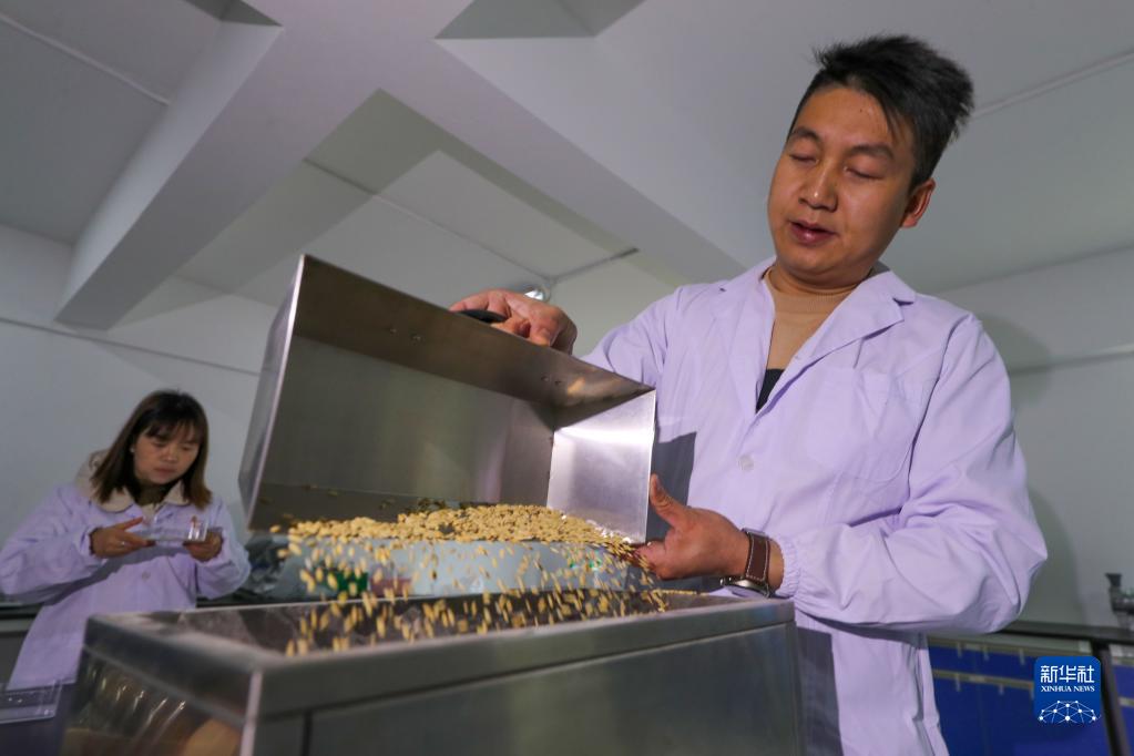 2月20日,技術(shù)員在貴州省黔東南苗族侗族自治州岑鞏縣一家雜交水稻制種公司檢測(cè)種子的發(fā)芽率。