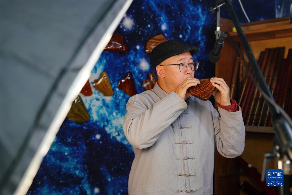 2月20日,陶笛藝人侯義敏在直播中吹奏木質(zhì)陶笛。