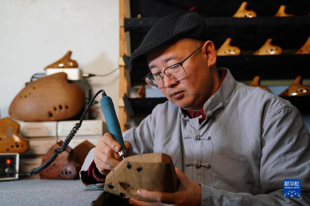2月20日,陶笛藝人侯義敏在制作木質陶笛。