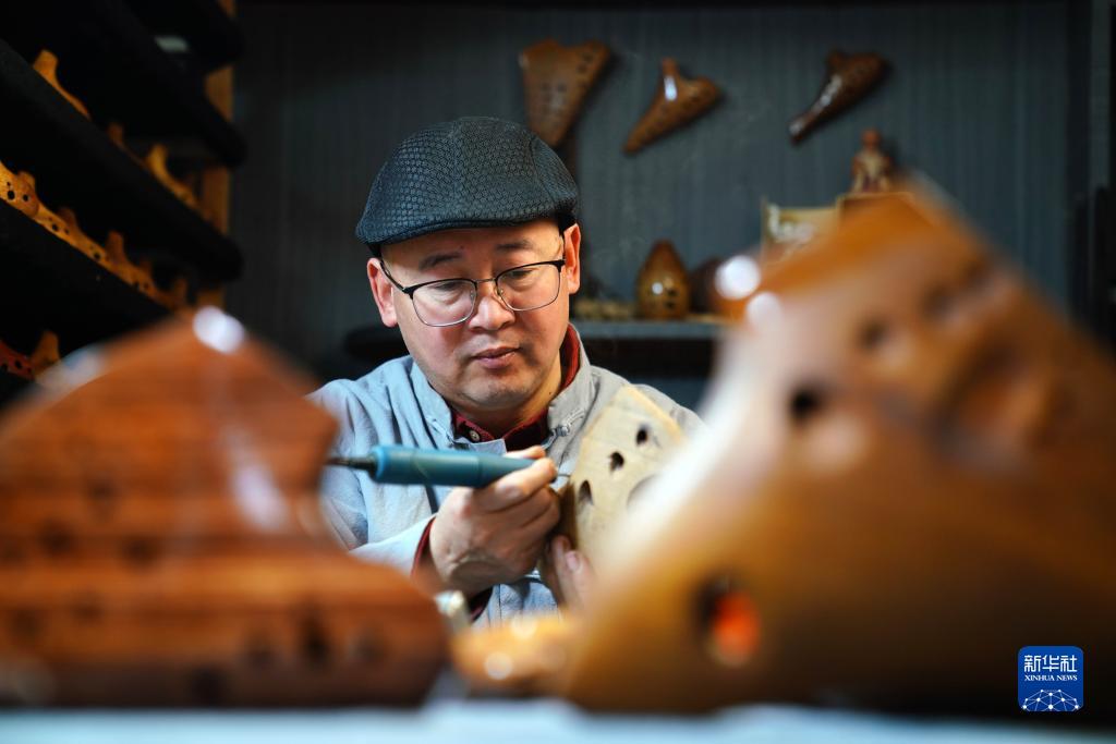 2月20日,陶笛藝人侯義敏在制作木質陶笛。