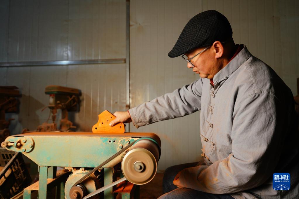 2月20日,陶笛藝人侯義敏打磨木質(zhì)陶笛半成品。
