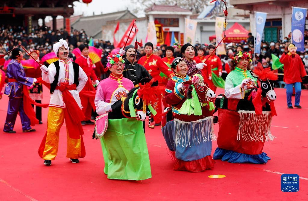 2月21日,在山西省臨汾市襄汾縣陶寺鄉(xiāng)陶寺村,民間社火隊(duì)在“二月二龍?zhí)ь^社火節(jié)”活動(dòng)中表演傳統(tǒng)民俗“跑驢”。