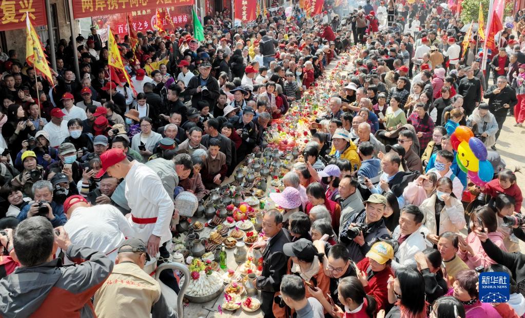 2月21日,在福建省龍巖市長汀縣濯田鎮升平村,村民們參加“百壺宴”民俗活動(無人機照片)。