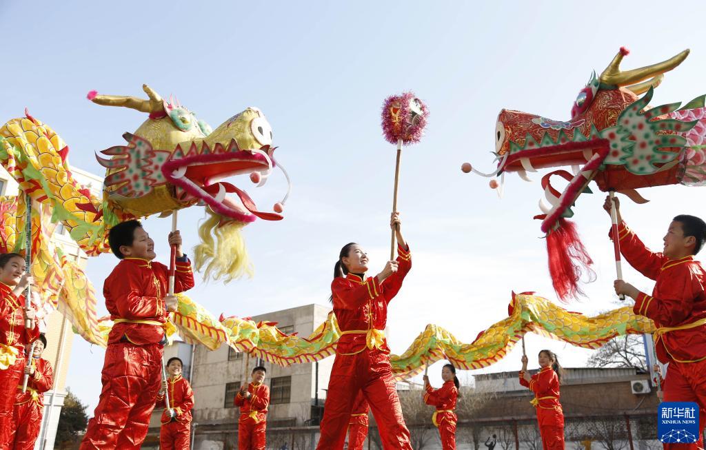 2月21日,河北省邢臺(tái)市東牛角小學(xué)學(xué)生在表演舞龍。