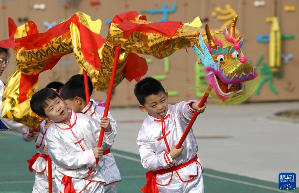 2月21日,在河北省石家莊市井陘礦區天護幼兒園,小朋友們在“二月二 龍抬頭”主題活動中表演舞龍。