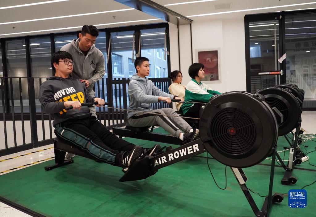 2月20日,在北京大學附屬中學,學生在體育課中進行智能劃船機練習。