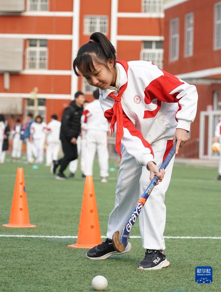 2月21日,在人大附中實驗小學,學生在體育課中進行曲棍球基本技術動作練習。