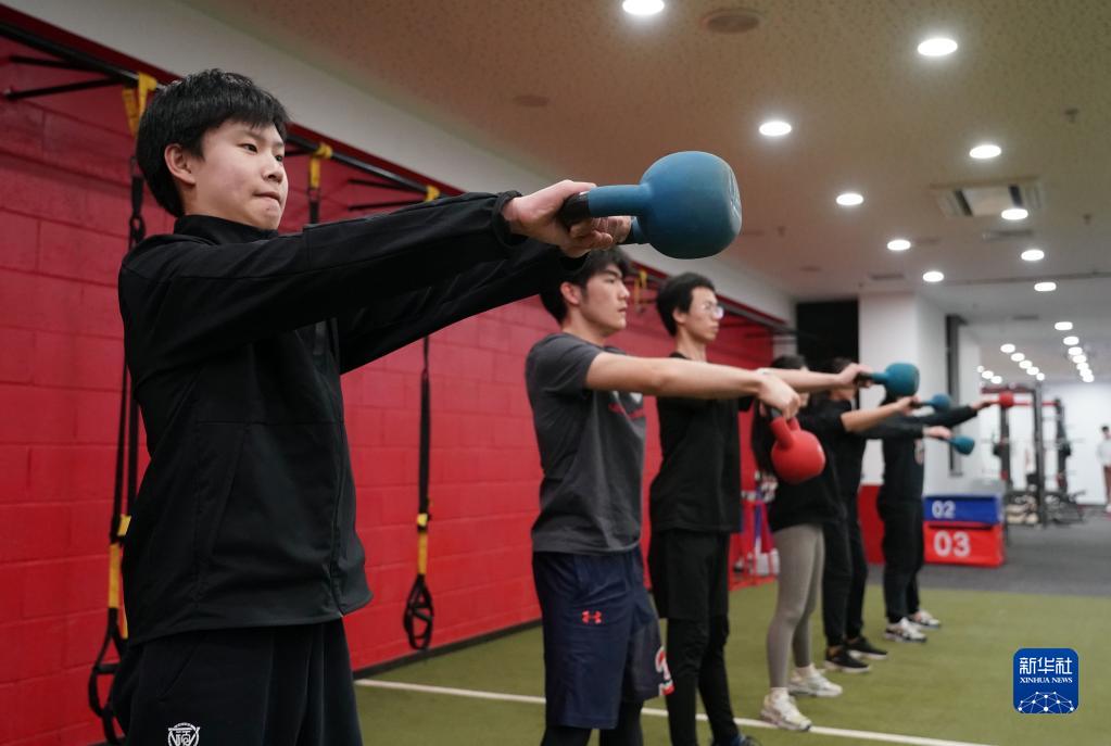 2月20日,在北京大學附屬中學,學生在體育課中進行壺鈴挺身練習。