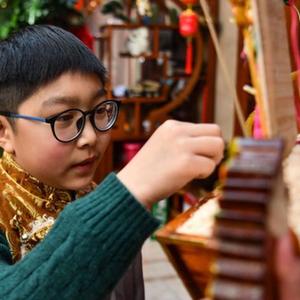 2月21日,在西藏拉薩,身著藏裝的姑娘在吃寓意五谷豐登的“切瑪”。