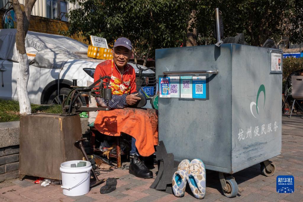 2月21日,修鞋匠金榮祥在杭州市西湖區北山街道便民服務攤位修鞋。北山街道幫助轄區內6處便民服務攤位統一辦理了杭州市便民服務證,方便他們為老城區內的居民提供便民服務。