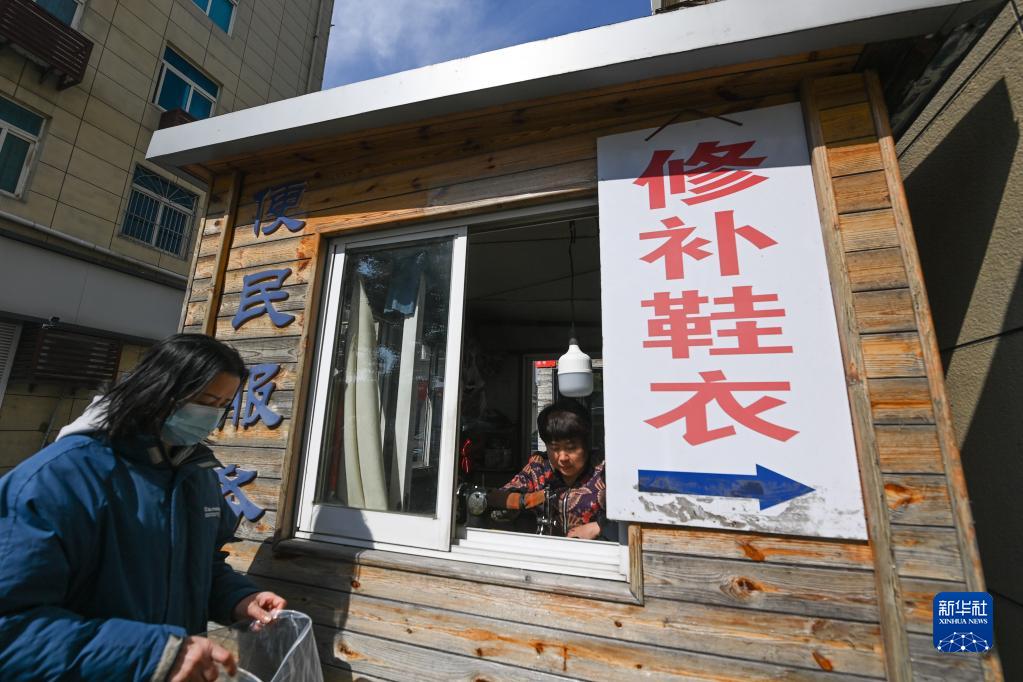 2月21日,邱芝英(右)在浙江省杭州市富陽區銀湖街道高橋社區的便民服務亭內給居民縫補褲子。該便民服務亭由社區提供,免租金和水電費,同時還組織黨員志愿者定期進行周邊環境保潔。銀湖街道在打造現代社區的過程中,設置多個“小修小補”便民服務亭,積極打造便民生活圈、滿足居民日常生活需求。