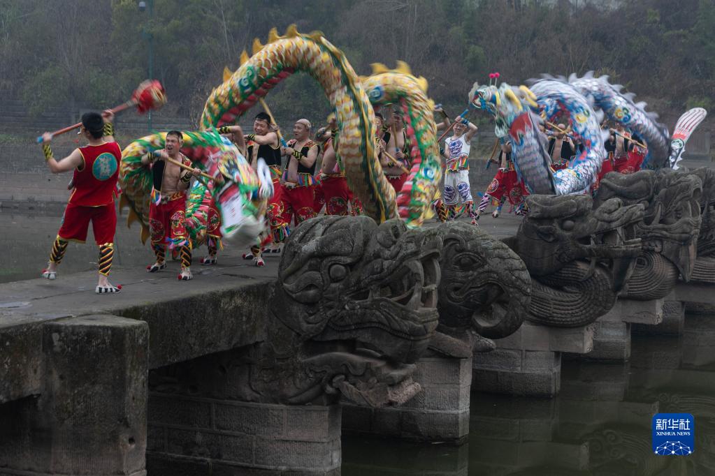 2月21日,在全國重點文物保護單位——瀘縣龍腦橋上,國家級非物質文化遺產“雨壇彩龍”正在表演中。