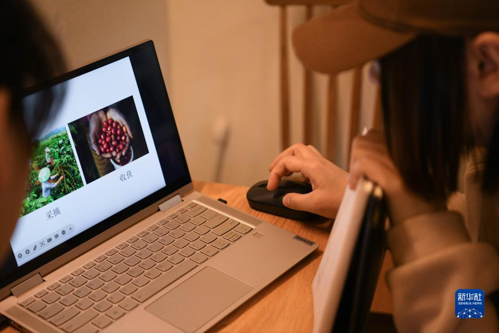 2月20日晚,楊倩(右)在咖啡店里給一位學(xué)員教授咖啡的相關(guān)知識。
