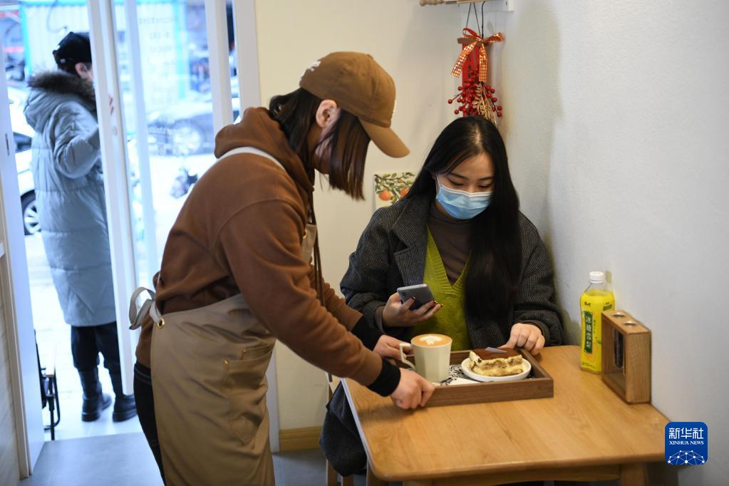 2月16日,楊倩在咖啡店里給客人端上飲品和甜點(diǎn)。