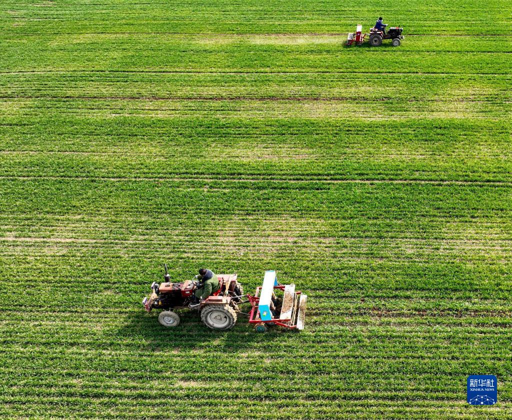 2月21日,在安徽省亳州市譙城區(qū)十河鎮(zhèn)位李村,農(nóng)民給麥田施肥(無人機照片)。
