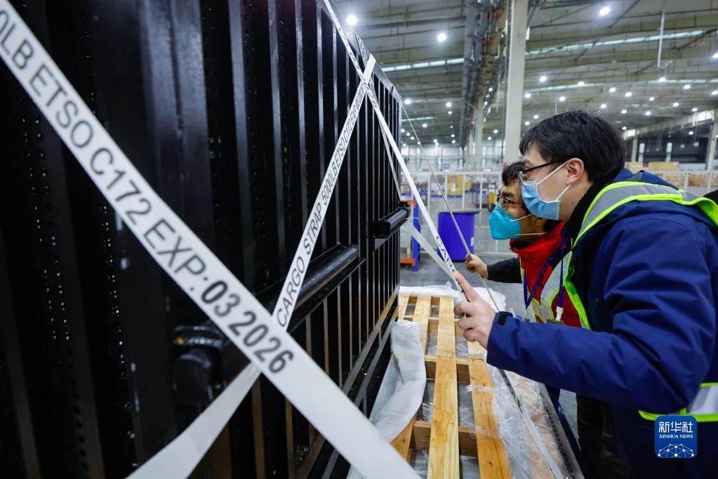 2月21日,大熊貓“香香”抵達成都雙流國際機場海關查驗區,工作人員和中國大熊貓保護研究中心的獸醫(右二)對其進行查驗。