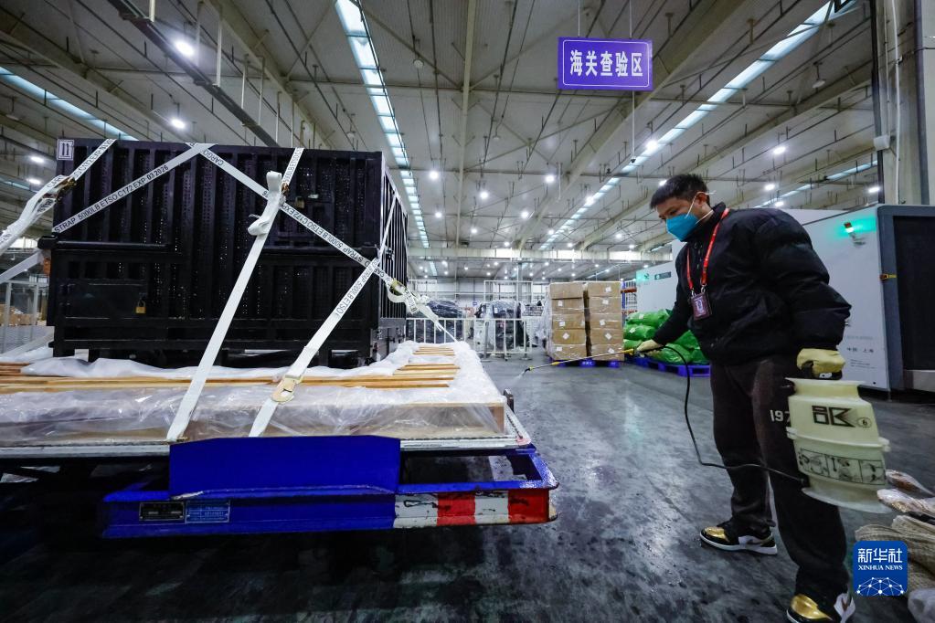 2月21日,大熊貓“香香”抵達(dá)成都雙流國(guó)際機(jī)場(chǎng)海關(guān)查驗(yàn)區(qū),工作人員對(duì)裝載“香香”的車輛消毒。
