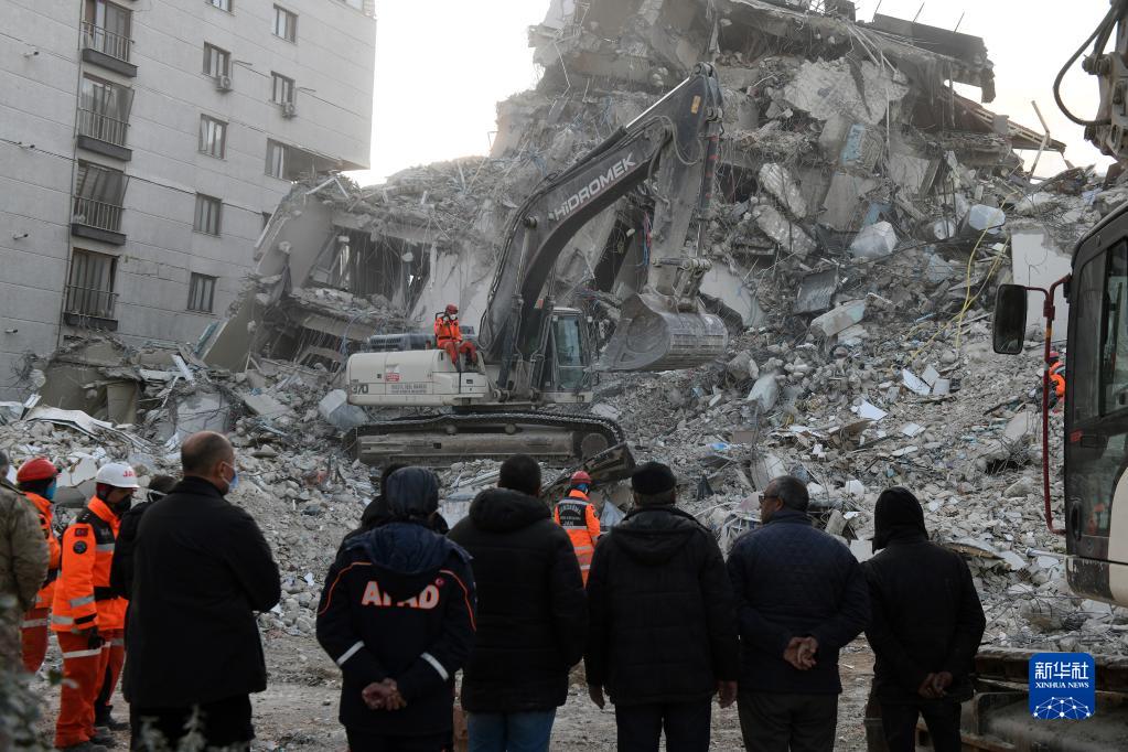 2月21日,工作人員利用大型機(jī)械在土耳其哈塔伊省清理廢墟。