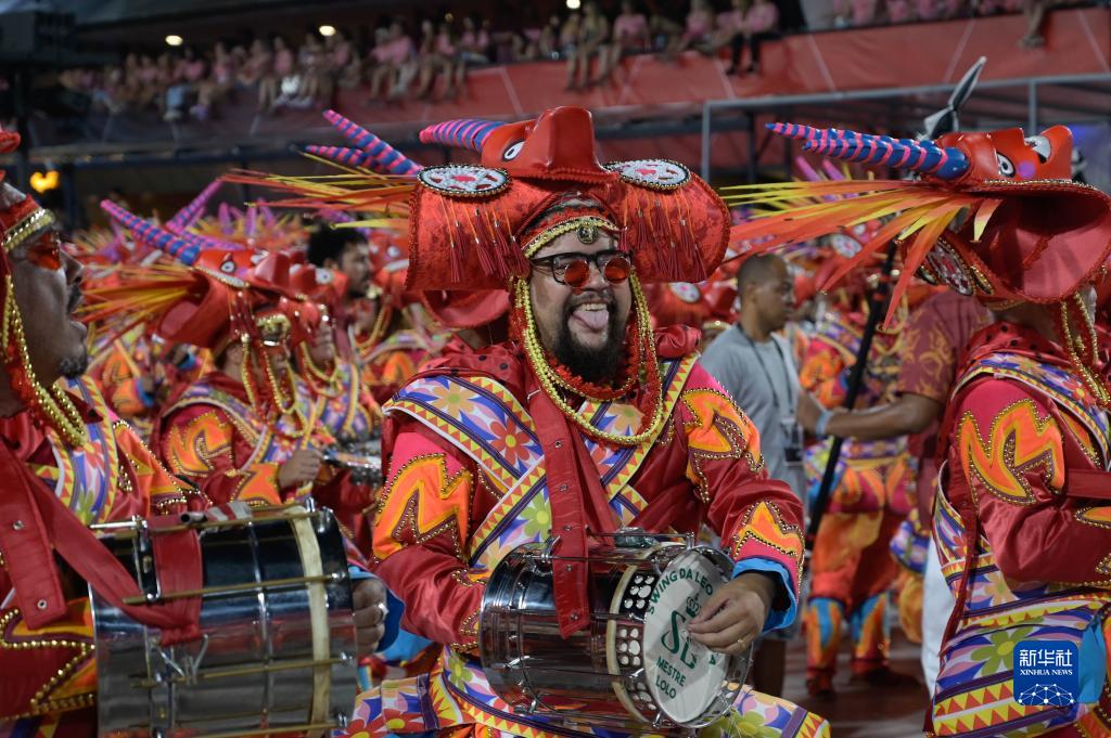 2月21日凌晨,在巴西里約熱內盧桑巴大道,一名桑巴舞校演員參加狂歡節游行。