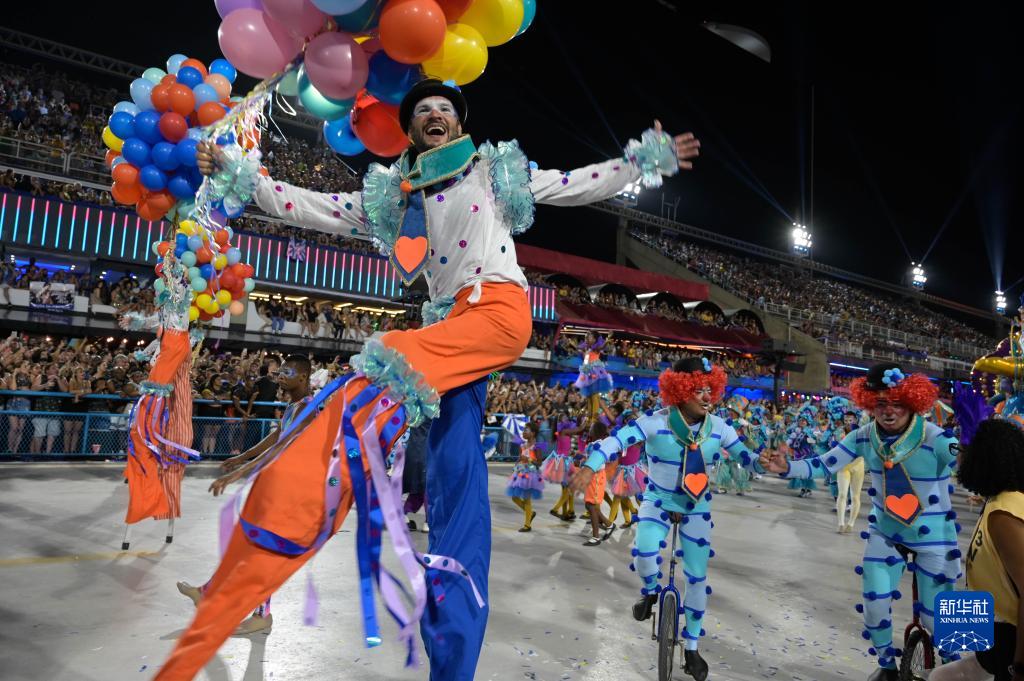 2月21日凌晨,在巴西里約熱內(nèi)盧桑巴大道,一名桑巴舞校演員參加狂歡節(jié)游行。