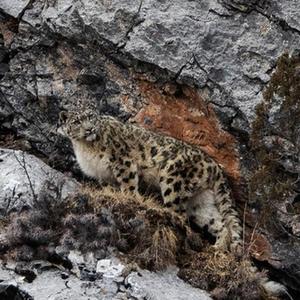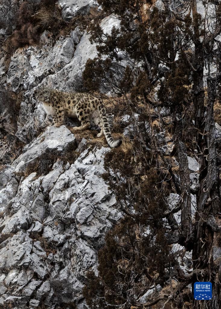 2月21日,在青海省玉樹藏族自治州雜多縣昂賽鄉境內的昂賽大峽谷內,一只雪豹在向上攀爬。