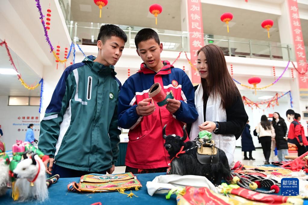 2月21日,在西安市浐灞第一中學舉行的藏歷新年團拜活動上,家長和學生參觀藏族文化展。
