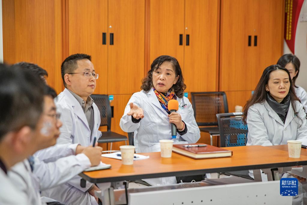 2月16日,在重慶醫(yī)科大學(xué)附屬兒童醫(yī)院兩江院區(qū),李秋(中)與腎臟內(nèi)科的醫(yī)護(hù)人員交流時(shí)發(fā)言。