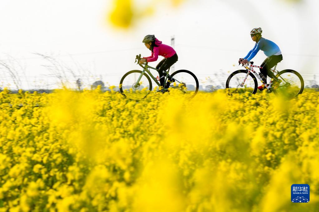 2月21日,騎行愛好者在江西省樟樹市永泰鎮官湖村油菜花海中騎行、賞花。