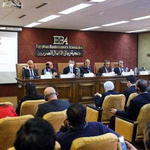 這是2月20日在埃及開羅拍攝的中埃企業(yè)家研討會現(xiàn)場。