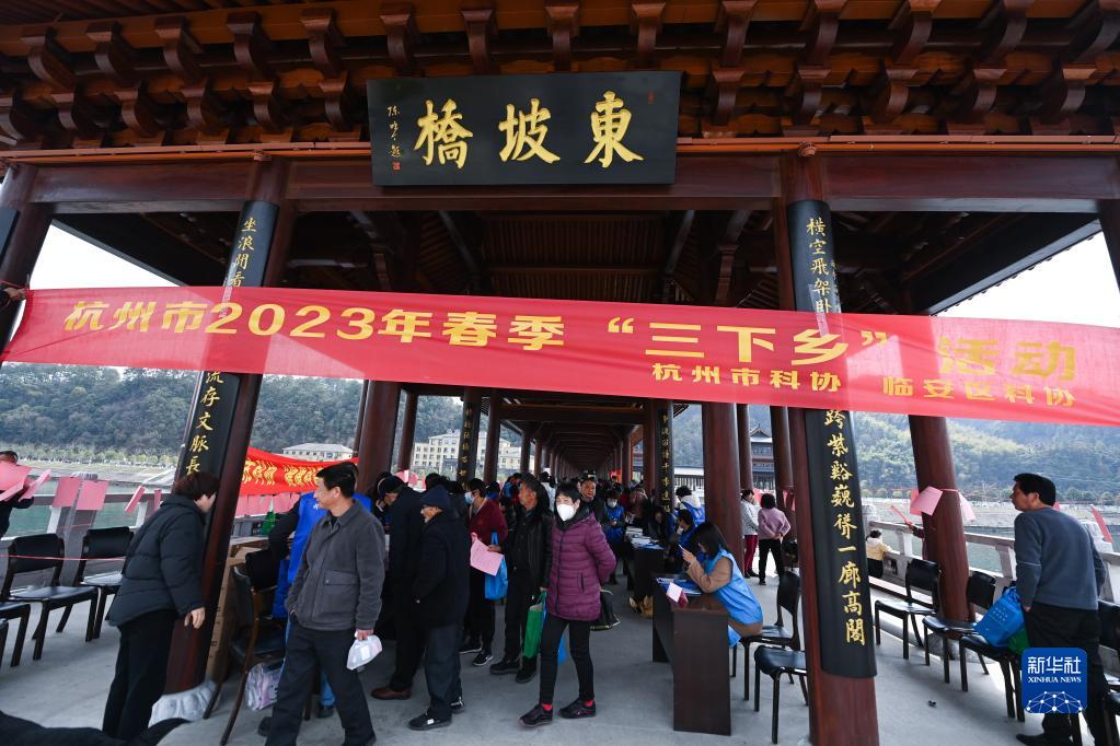2月22日,在杭州市臨安區昌化鎮的東坡橋上舉行的春季“三下鄉”服務活動吸引了大批當地百姓前來參加。