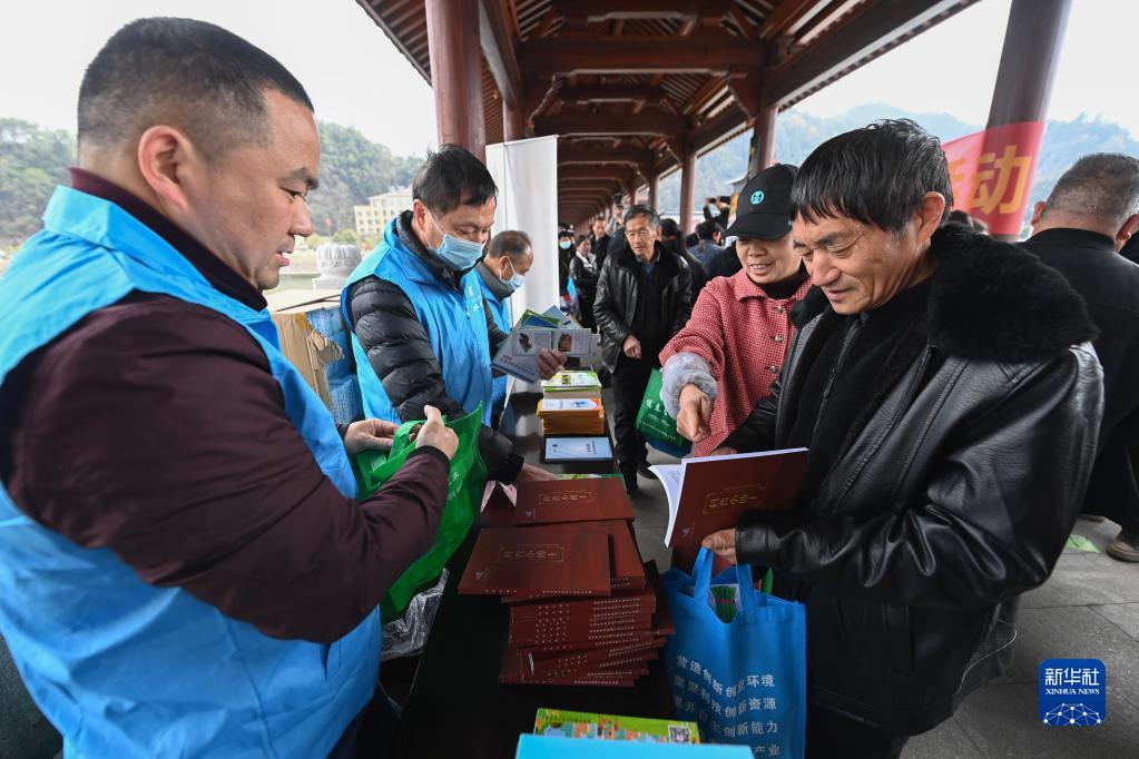2月22日,在杭州市臨安區昌化鎮的東坡橋上,臨安區科學技術協會“三服務”小分隊的黨員志愿者將科普書籍贈送給當地群眾。