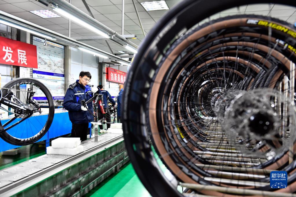 2月21日,在泰山瑞豹復(fù)合材料有限公司,工作人員在生產(chǎn)碳纖維自行車。