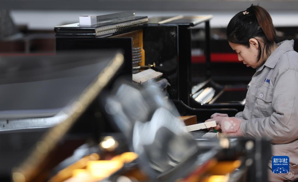 2月22日,工人在車間成品區內為成品鋼琴進行出廠前調教。